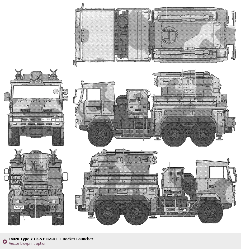 Raster blueprint of the Isuzu Type 73 3.5 t JGSDF + Rocket Launcher Heavy Truck. This free downloadable image can be used for graphic projects, digital design, and 3D modeling. The file provides accurate exterior proportions of the vehicle. Body type: Heavy Truck.