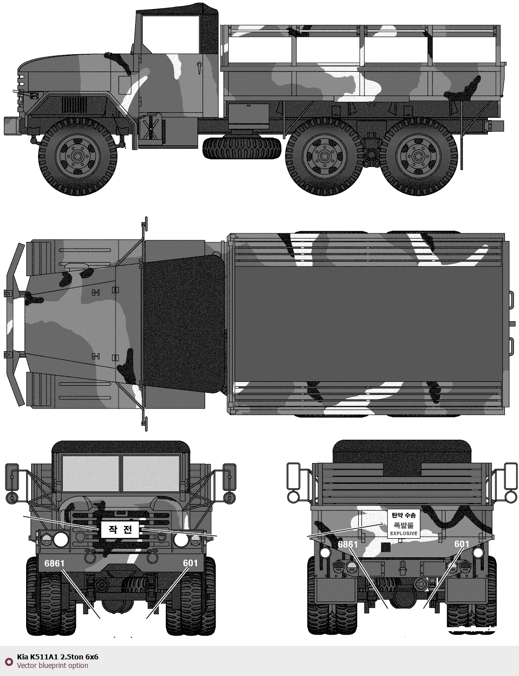 Raster blueprint of the KIA K511A1 2.5ton 6x6 Heavy Truck. This free downloadable image can be used for graphic projects, digital design, and 3D modeling. The file provides accurate exterior proportions of the vehicle. Body type: Heavy Truck.