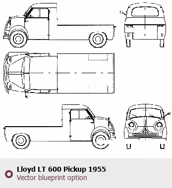 Raster blueprint of the 1955 Lloyd LT 600 Pickup Pickup Truck. This free downloadable image can be used for graphic projects, digital design, and 3D modeling. The file provides accurate exterior proportions of the vehicle. Model year: 1955. Body type: Pickup Truck.