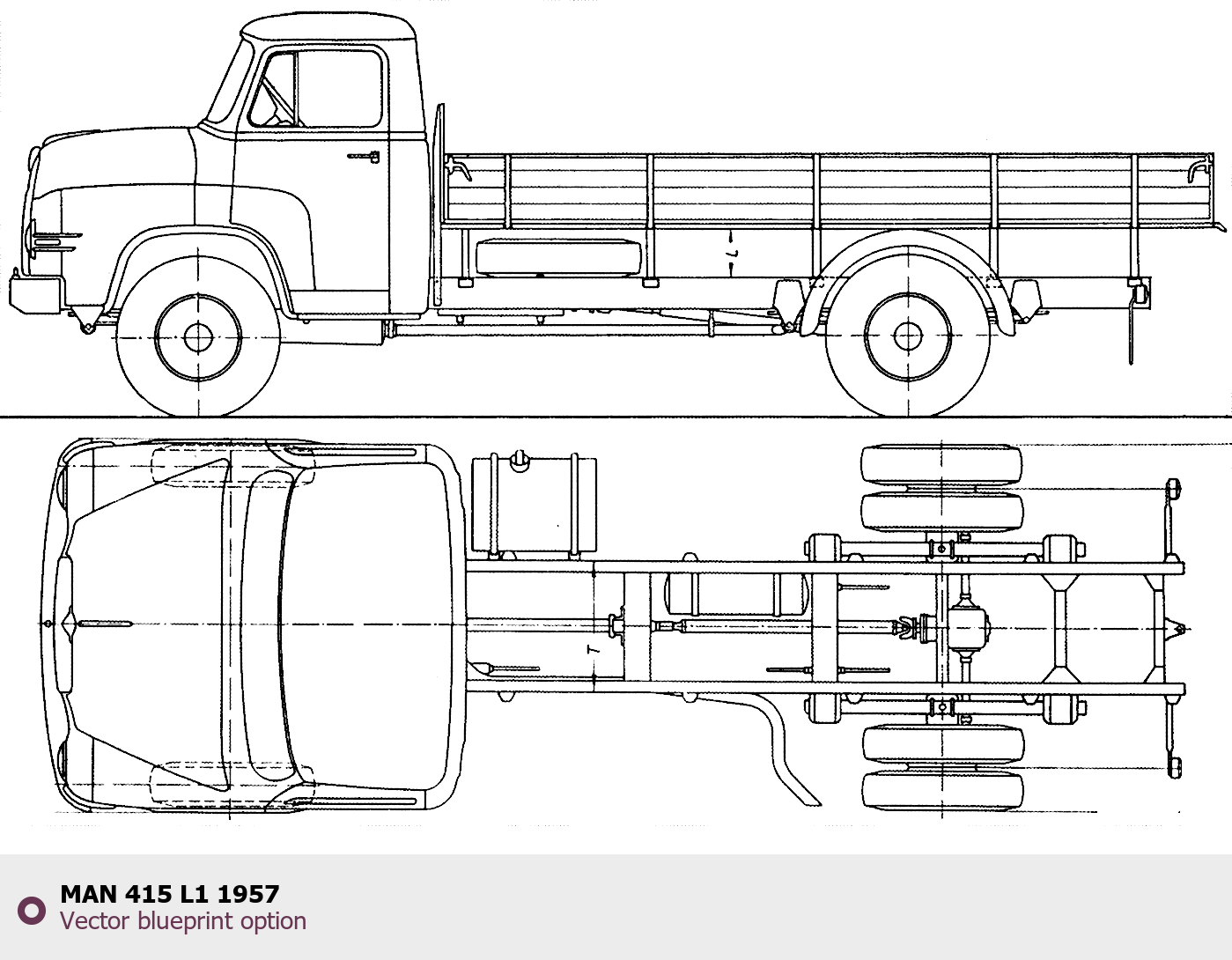 Raster blueprint of the 1957 MAN 415 L1 Heavy Truck. This free downloadable image can be used for graphic projects, digital design, and 3D modeling. The file provides accurate exterior proportions of the vehicle. Model year: 1957. Body type: Heavy Truck.