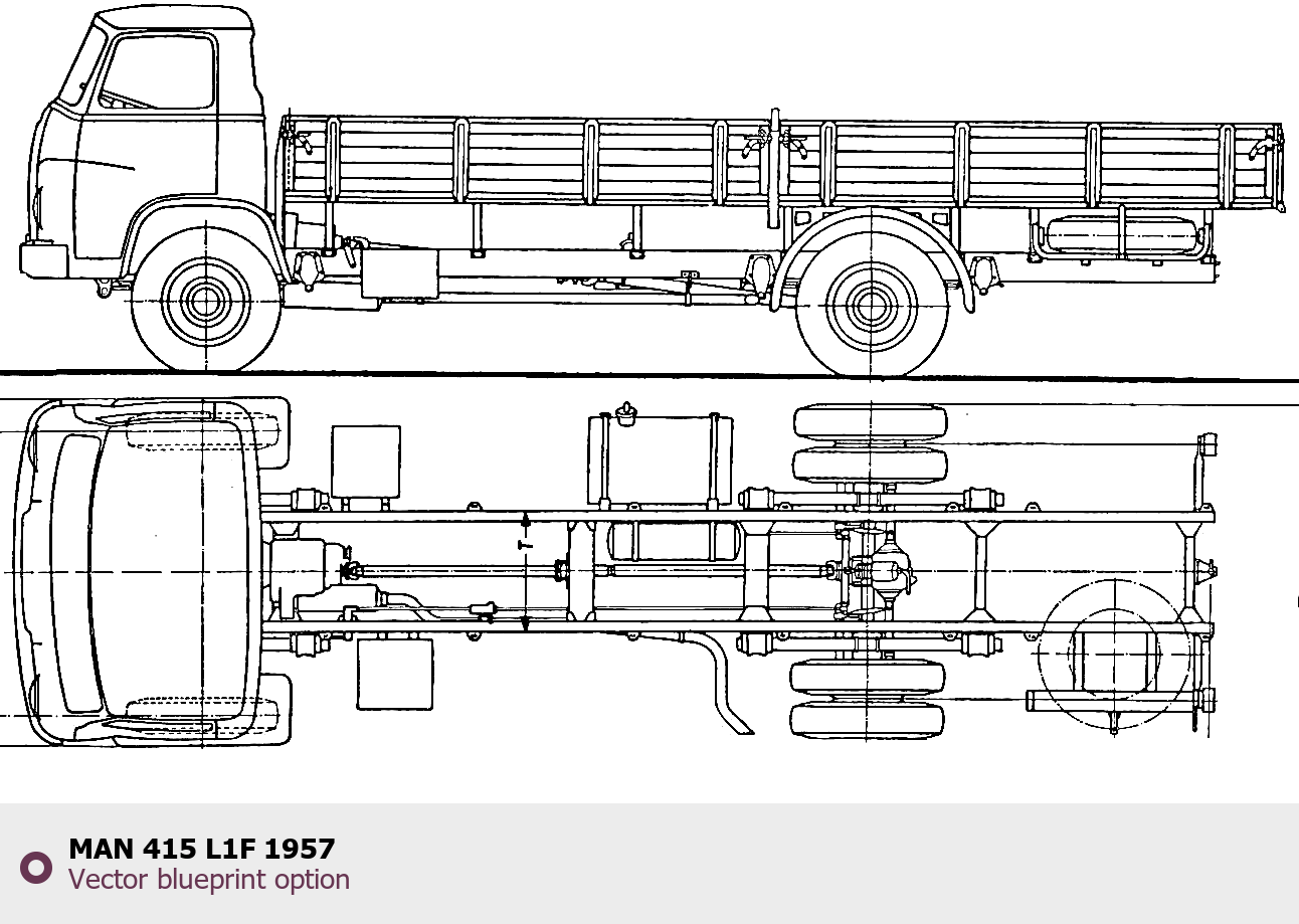 Raster blueprint of the 1957 MAN 415 L1F Heavy Truck. This free downloadable image can be used for graphic projects, digital design, and 3D modeling. The file provides accurate exterior proportions of the vehicle. Model year: 1957. Body type: Heavy Truck.