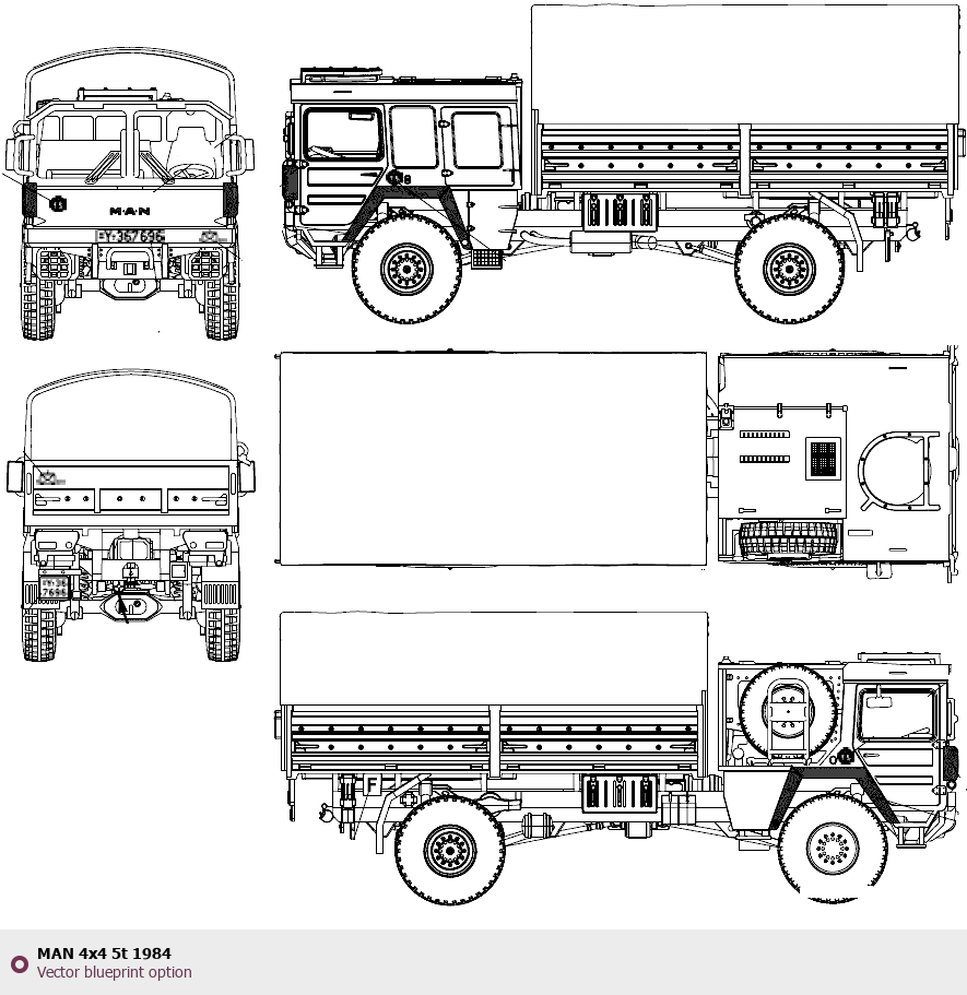 Raster blueprint of the 1984 MAN 4x4 5t Heavy Truck. This free downloadable image can be used for graphic projects, digital design, and 3D modeling. The file provides accurate exterior proportions of the vehicle. Model year: 1984. Body type: Heavy Truck.