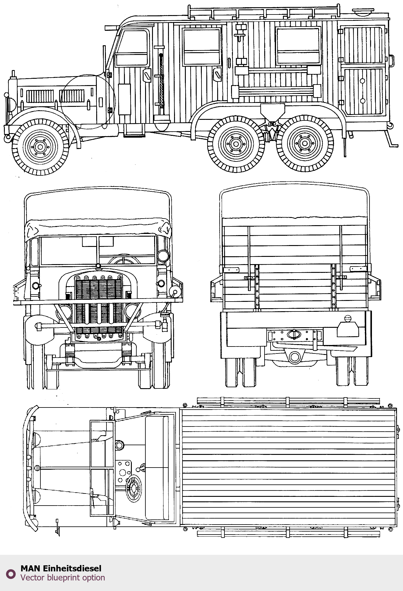 Raster blueprint of the MAN Einheitsdiesel Heavy Truck. This free downloadable image can be used for graphic projects, digital design, and 3D modeling. The file provides accurate exterior proportions of the vehicle. Body type: Heavy Truck.