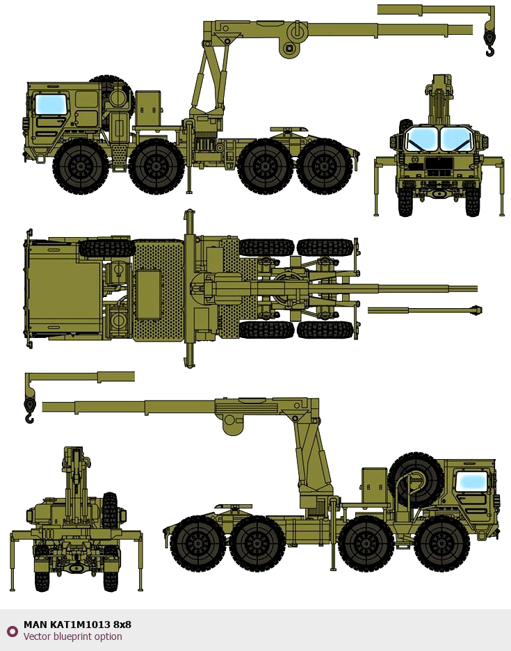 Raster blueprint of the MAN KAT1M1013 8x8 Heavy Truck. This free downloadable image can be used for graphic projects, digital design, and 3D modeling. The file provides accurate exterior proportions of the vehicle. Body type: Heavy Truck.