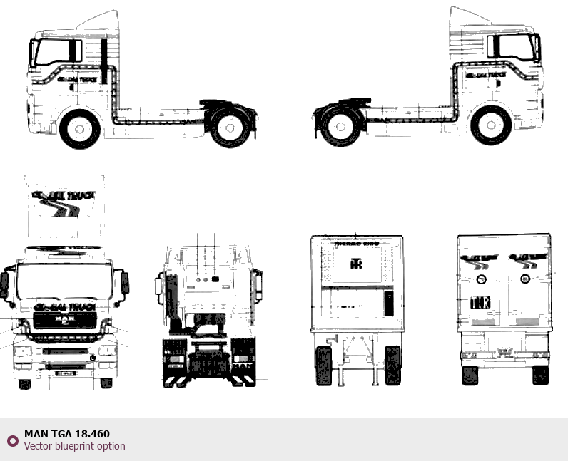 Raster blueprint of the MAN TGA 18.460 Heavy Truck. This free downloadable image can be used for graphic projects, digital design, and 3D modeling. The file provides accurate exterior proportions of the vehicle. Body type: Heavy Truck.