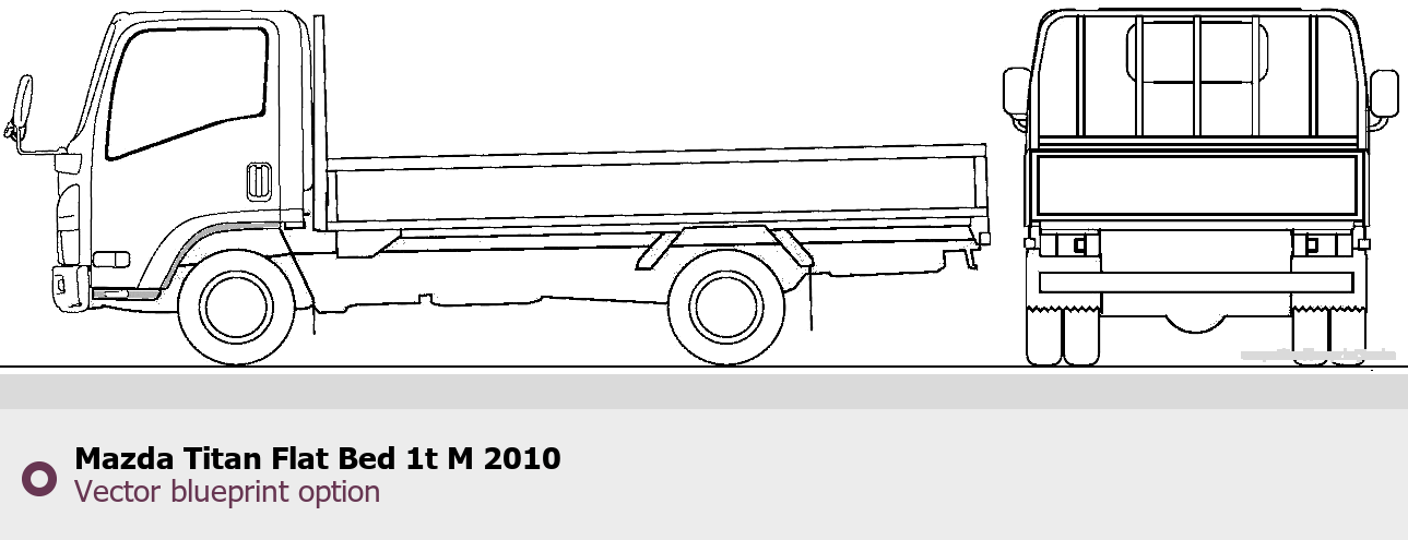 Raster blueprint of the 2010 Mazda Titan Flat Bed 1t M Heavy Truck. This free downloadable image can be used for graphic projects, digital design, and 3D modeling. The file provides accurate exterior proportions of the vehicle. Model year: 2010. Body type: Heavy Truck.