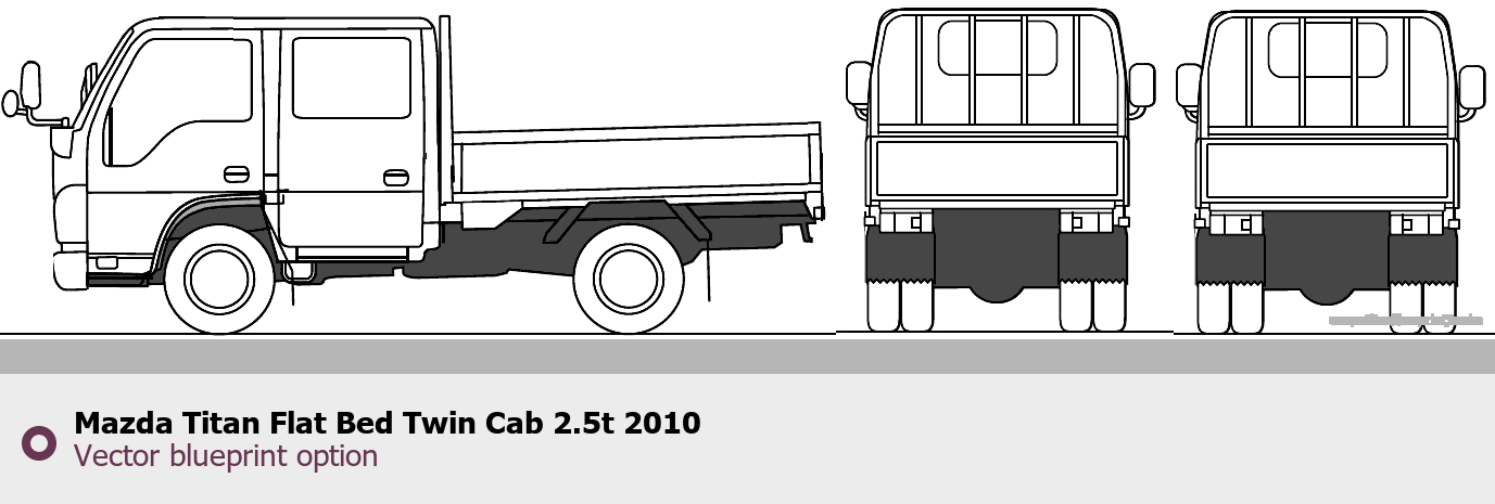 Raster blueprint of the 2010 Mazda Titan Flat Bed Twin Cab 2.5t Heavy Truck. This free downloadable image can be used for graphic projects, digital design, and 3D modeling. The file provides accurate exterior proportions of the vehicle. Model year: 2010. Body type: Heavy Truck.