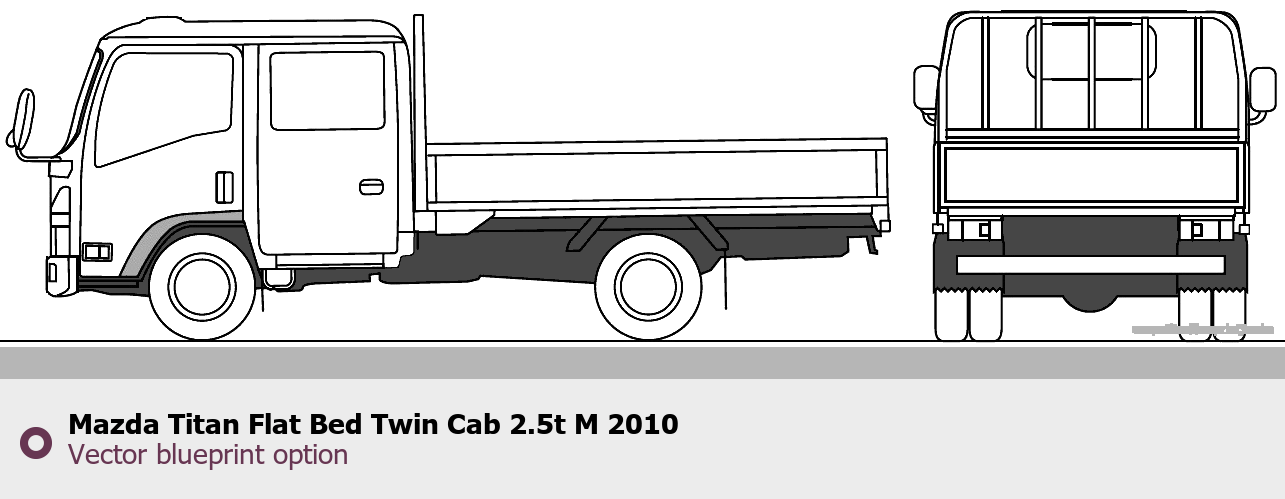Raster blueprint of the 2010 Mazda Titan Flat Bed Twin Cab 2.5t M Heavy Truck. This free downloadable image can be used for graphic projects, digital design, and 3D modeling. The file provides accurate exterior proportions of the vehicle. Model year: 2010. Body type: Heavy Truck.
