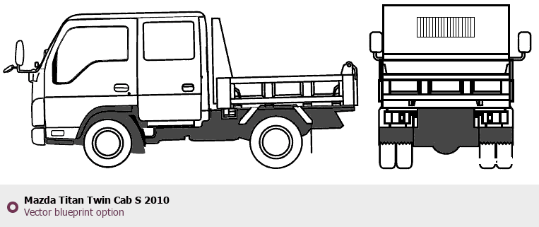 Raster blueprint of the 2010 Mazda Titan Twin Cab S Heavy Truck. This free downloadable image can be used for graphic projects, digital design, and 3D modeling. The file provides accurate exterior proportions of the vehicle. Model year: 2010. Body type: Heavy Truck.