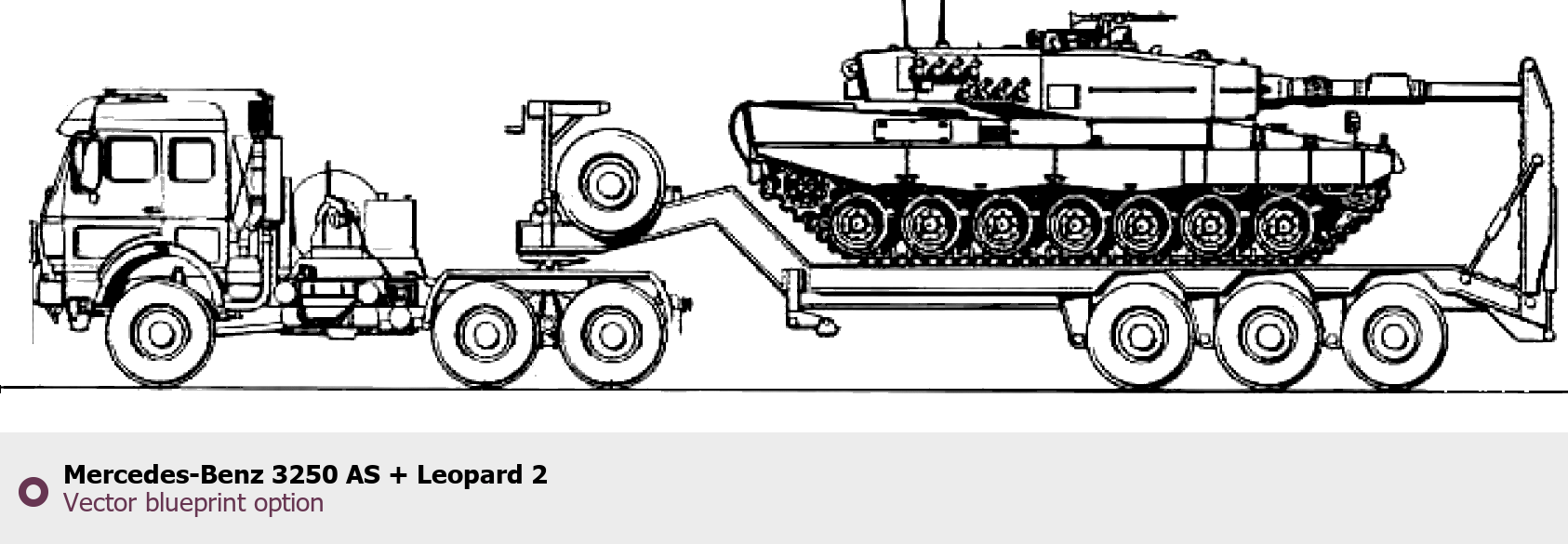 Raster blueprint of the Mercedes-Benz 3250 AS + Leopard 2 Heavy Truck. This free downloadable image can be used for graphic projects, digital design, and 3D modeling. The file provides accurate exterior proportions of the vehicle. Body type: Heavy Truck.