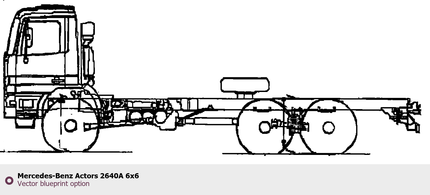 Raster blueprint of the Mercedes-Benz Actors 2640A 6x6 Heavy Truck. This free downloadable image can be used for graphic projects, digital design, and 3D modeling. The file provides accurate exterior proportions of the vehicle. Body type: Heavy Truck.