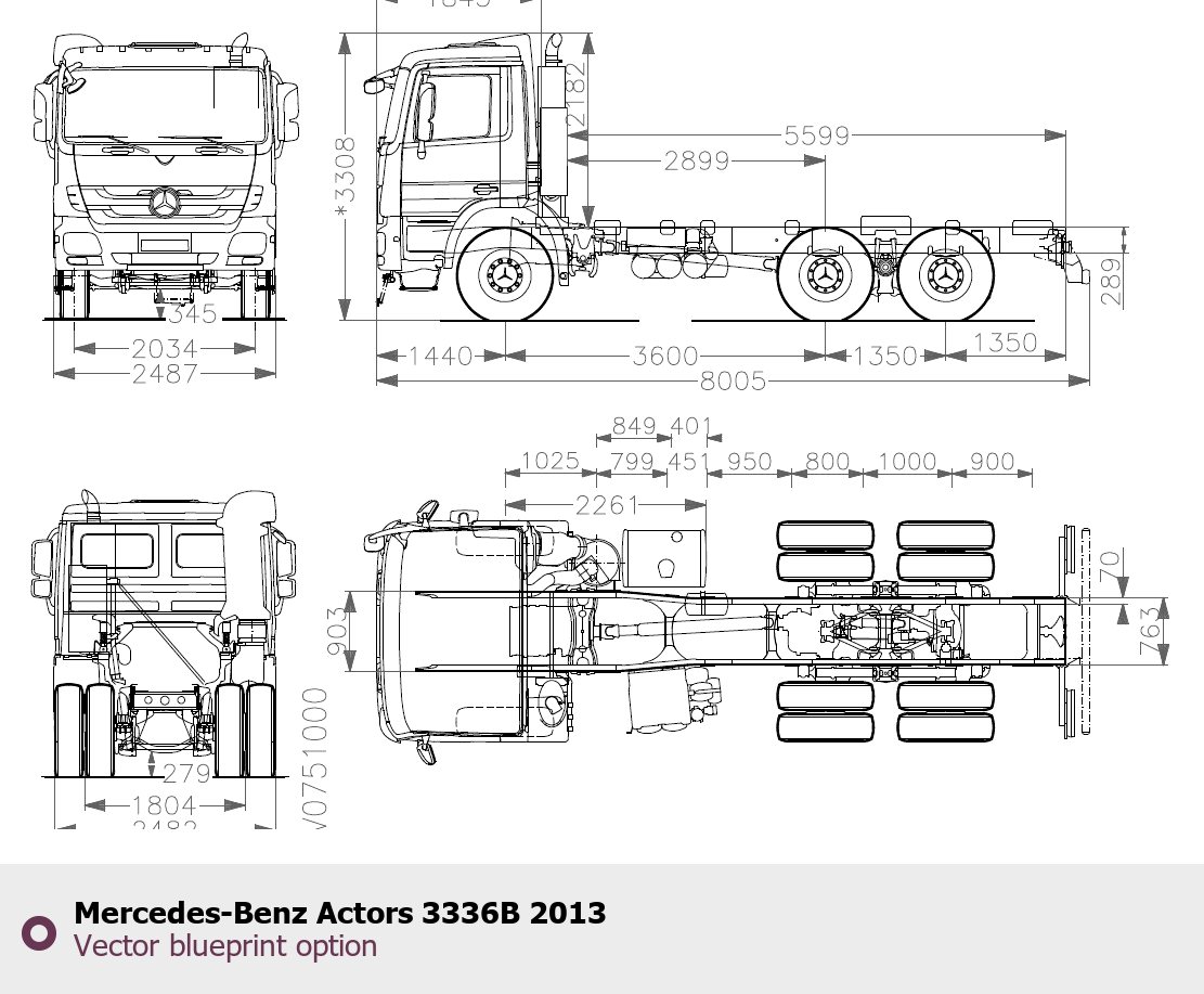 Raster blueprint of the 2013 Mercedes-Benz Actors 3336B Heavy Truck. This free downloadable image can be used for graphic projects, digital design, and 3D modeling. The file provides accurate exterior proportions of the vehicle. Model year: 2013. Body type: Heavy Truck.