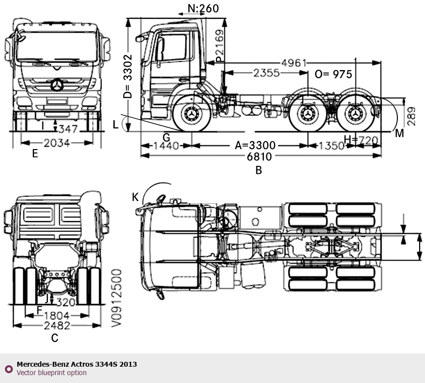 Raster blueprint of the 2013 Mercedes-Benz Actros 3344S Heavy Truck. This free downloadable image can be used for graphic projects, digital design, and 3D modeling. The file provides accurate exterior proportions of the vehicle. Model year: 2013. Body type: Heavy Truck.