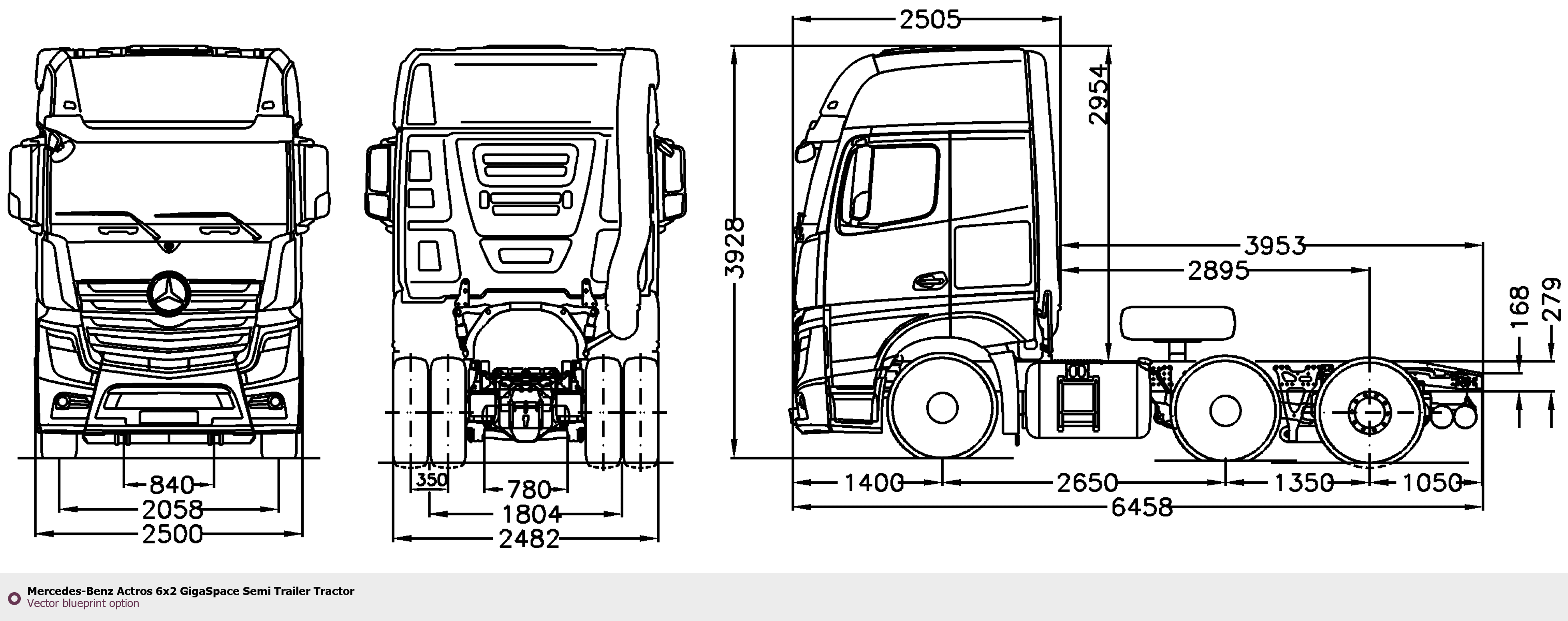 Raster blueprint of the Mercedes-Benz Actros 6x2 GigaSpace Semi Trailer Tractor Heavy Truck. This free downloadable image can be used for graphic projects, digital design, and 3D modeling. The file provides accurate exterior proportions of the vehicle. Body type: Heavy Truck.