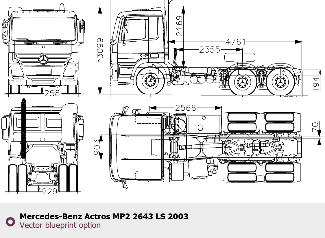 Raster blueprint of the 2003 Mercedes-Benz Actros MP2 2643 LS Heavy Truck. This free downloadable image can be used for graphic projects, digital design, and 3D modeling. The file provides accurate exterior proportions of the vehicle. Model year: 2003. Body type: Heavy Truck.