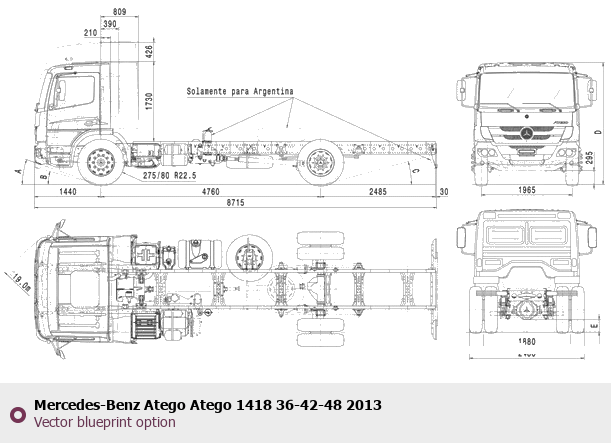 Raster blueprint of the 2013 Mercedes-Benz Atego Atego 1418 36-42-48 Heavy Truck. This free downloadable image can be used for graphic projects, digital design, and 3D modeling. The file provides accurate exterior proportions of the vehicle. Model year: 2013. Body type: Heavy Truck.