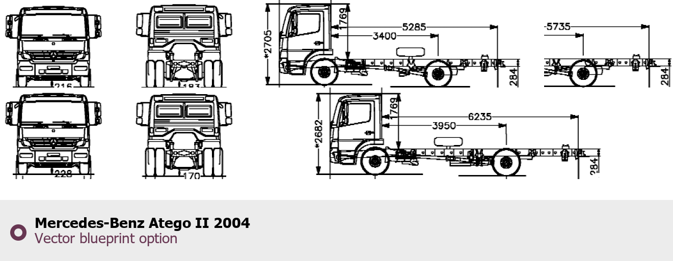 Raster blueprint of the 2004 Mercedes-Benz Atego II Heavy Truck. This free downloadable image can be used for graphic projects, digital design, and 3D modeling. The file provides accurate exterior proportions of the vehicle. Model year: 2004. Body type: Heavy Truck.