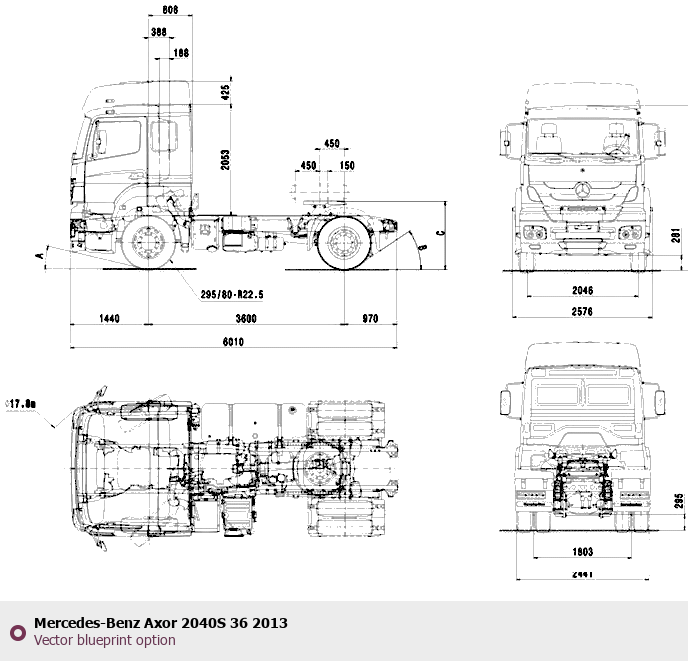 Raster blueprint of the 2013 Mercedes-Benz Axor 2040S 36 Heavy Truck. This free downloadable image can be used for graphic projects, digital design, and 3D modeling. The file provides accurate exterior proportions of the vehicle. Model year: 2013. Body type: Heavy Truck.
