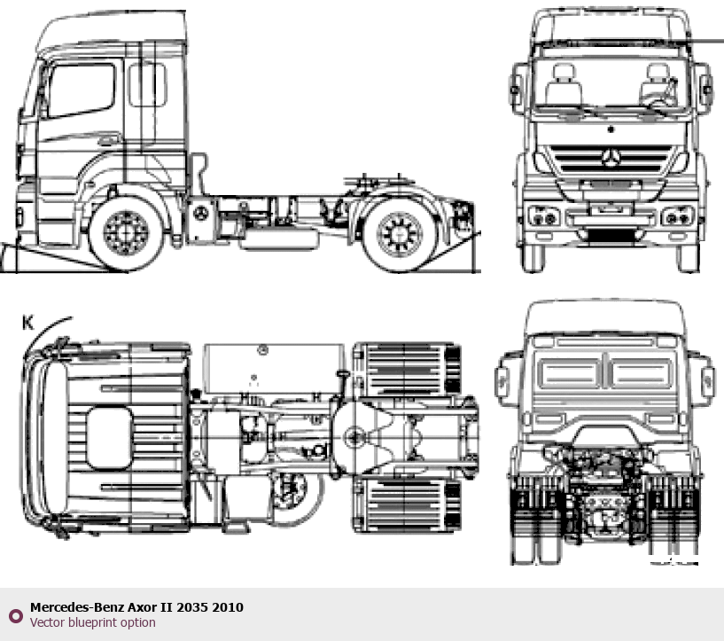 Raster blueprint of the 2010 Mercedes-Benz Axor II 2035 Heavy Truck. This free downloadable image can be used for graphic projects, digital design, and 3D modeling. The file provides accurate exterior proportions of the vehicle. Model year: 2010. Body type: Heavy Truck.