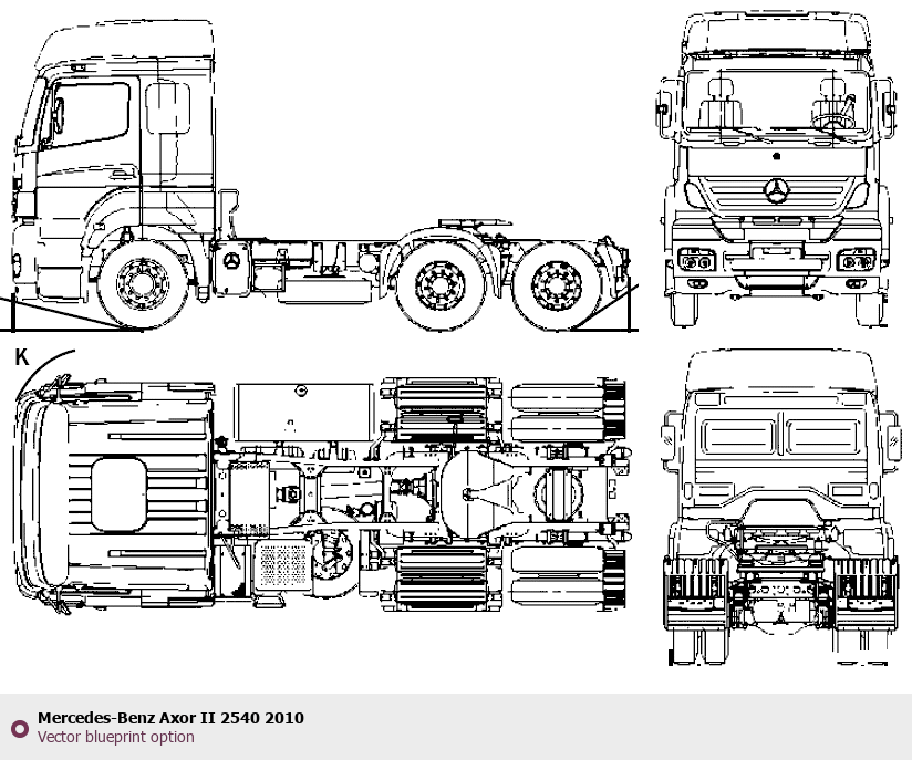 Raster blueprint of the 2010 Mercedes-Benz Axor II 2540 Heavy Truck. This free downloadable image can be used for graphic projects, digital design, and 3D modeling. The file provides accurate exterior proportions of the vehicle. Model year: 2010. Body type: Heavy Truck.