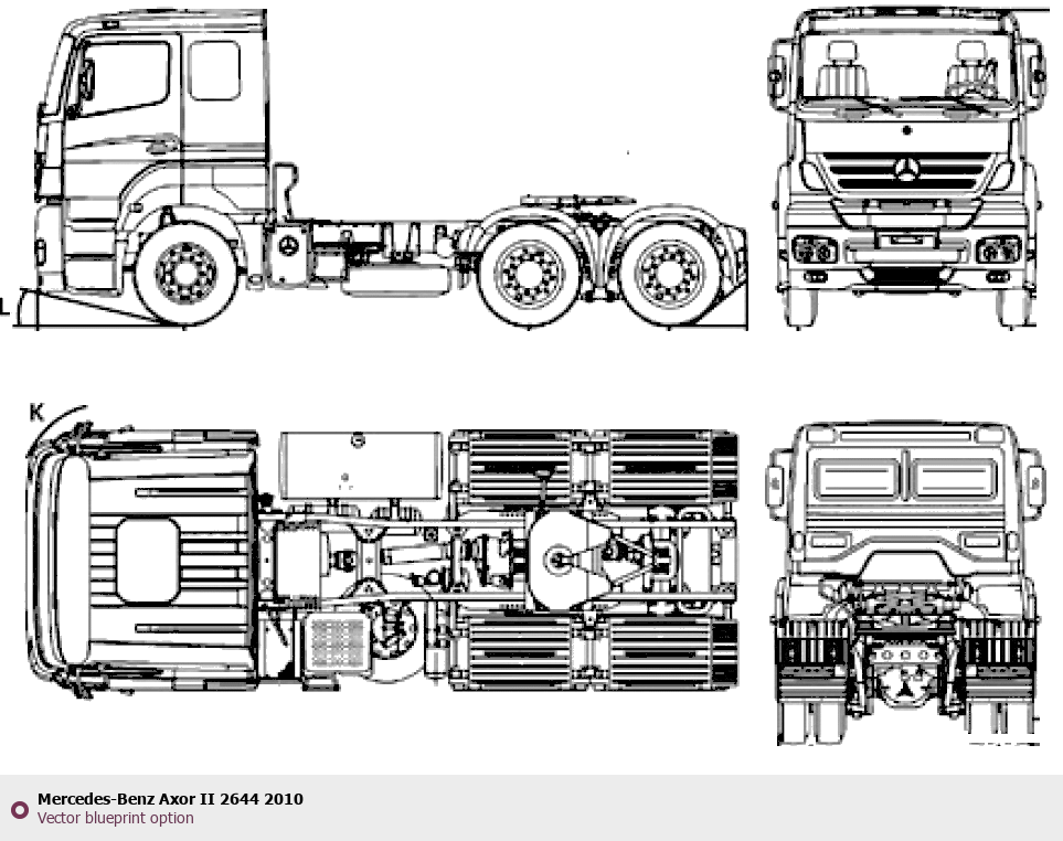 Raster blueprint of the 2010 Mercedes-Benz Axor II 2644 Heavy Truck. This free downloadable image can be used for graphic projects, digital design, and 3D modeling. The file provides accurate exterior proportions of the vehicle. Model year: 2010. Body type: Heavy Truck.