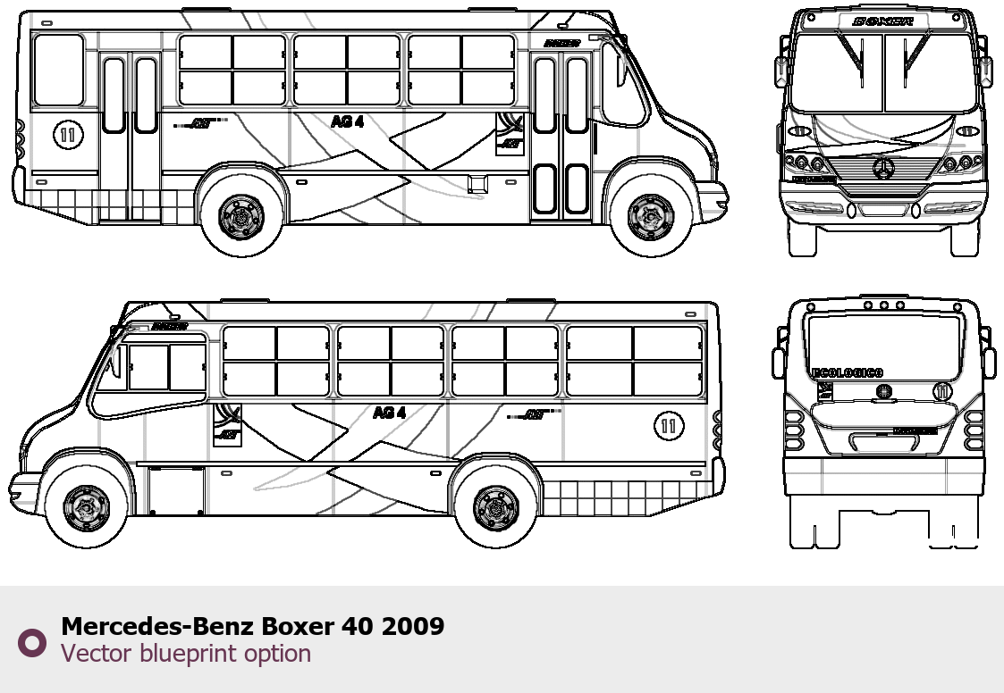 Raster blueprint of the 2009 Mercedes-Benz Boxer 40 Bus. This free downloadable image can be used for graphic projects, digital design, and 3D modeling. The file provides accurate exterior proportions of the vehicle. Model year: 2009. Body type: Bus.