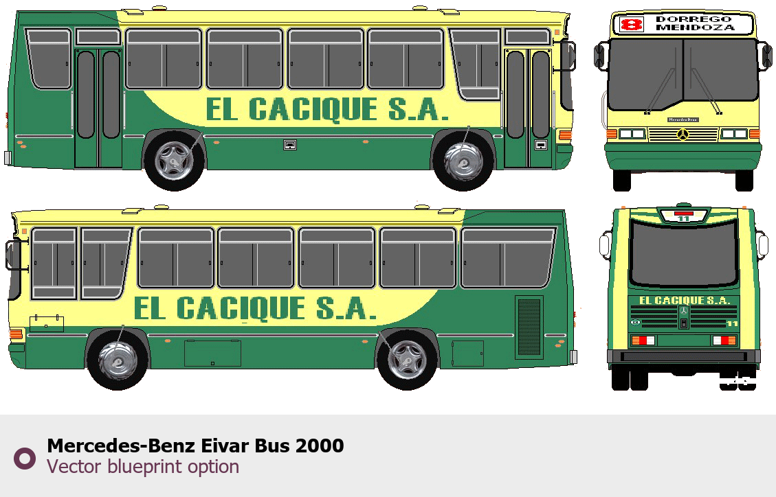 Raster blueprint of the 2000 Mercedes-Benz Eivar Bus Bus. This free downloadable image can be used for graphic projects, digital design, and 3D modeling. The file provides accurate exterior proportions of the vehicle. Model year: 2000. Body type: Bus.