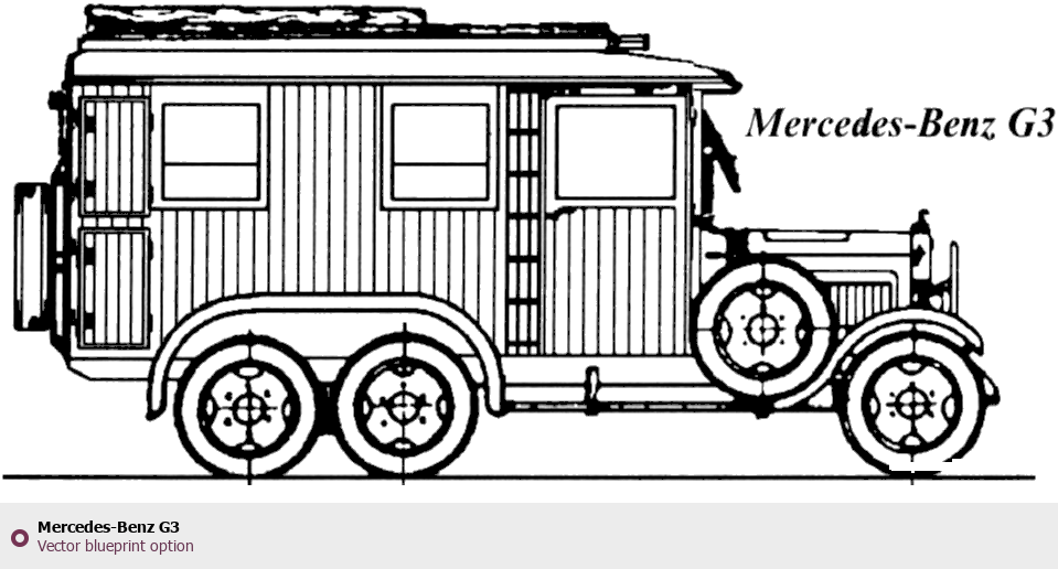 Raster blueprint of the Mercedes-Benz G3 Heavy Truck. This free downloadable image can be used for graphic projects, digital design, and 3D modeling. The file provides accurate exterior proportions of the vehicle. Body type: Heavy Truck.