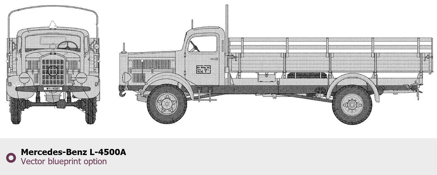 Raster blueprint of the Mercedes-Benz L-4500A Heavy Truck. This free downloadable image can be used for graphic projects, digital design, and 3D modeling. The file provides accurate exterior proportions of the vehicle. Body type: Heavy Truck.
