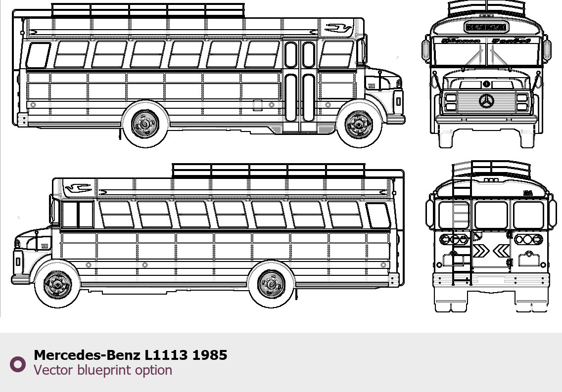 Raster blueprint of the 1985 Mercedes-Benz L1113 Bus. This free downloadable image can be used for graphic projects, digital design, and 3D modeling. The file provides accurate exterior proportions of the vehicle. Model year: 1985. Body type: Bus.