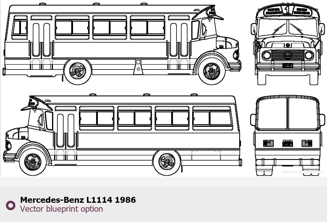 Raster blueprint of the 1986 Mercedes-Benz L1114 Bus. This free downloadable image can be used for graphic projects, digital design, and 3D modeling. The file provides accurate exterior proportions of the vehicle. Model year: 1986. Body type: Bus.
