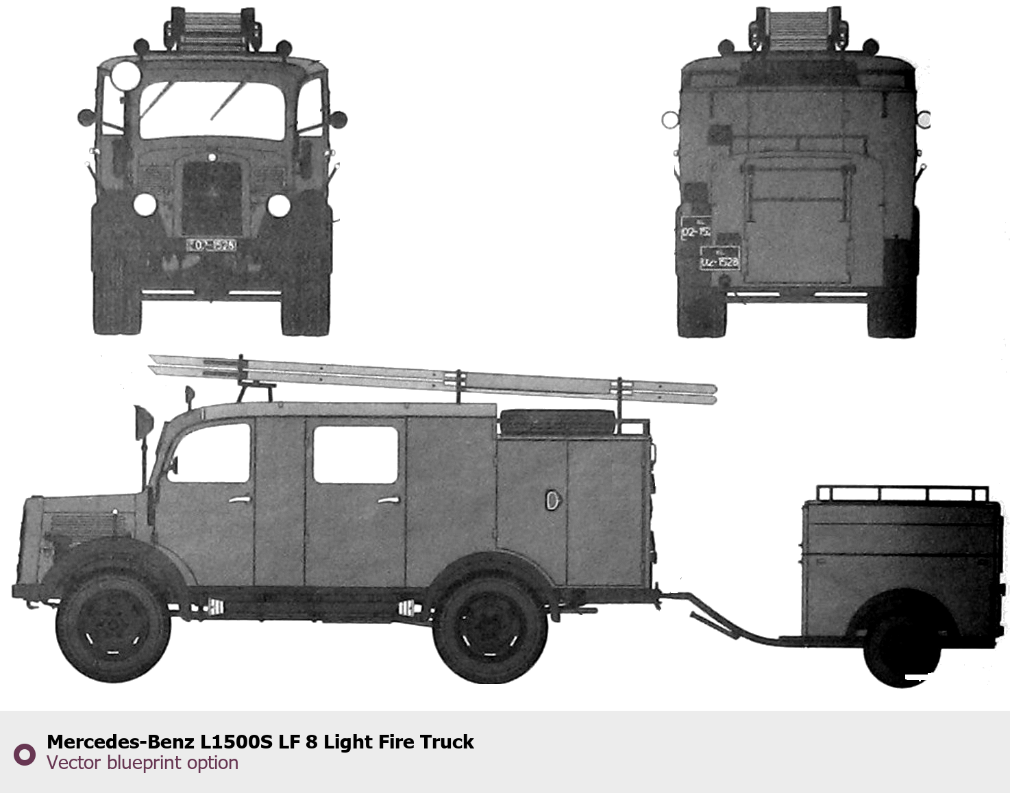 Raster blueprint of the Mercedes-Benz L1500S LF 8 Light Fire Truck Heavy Truck. This free downloadable image can be used for graphic projects, digital design, and 3D modeling. The file provides accurate exterior proportions of the vehicle. Body type: Heavy Truck.