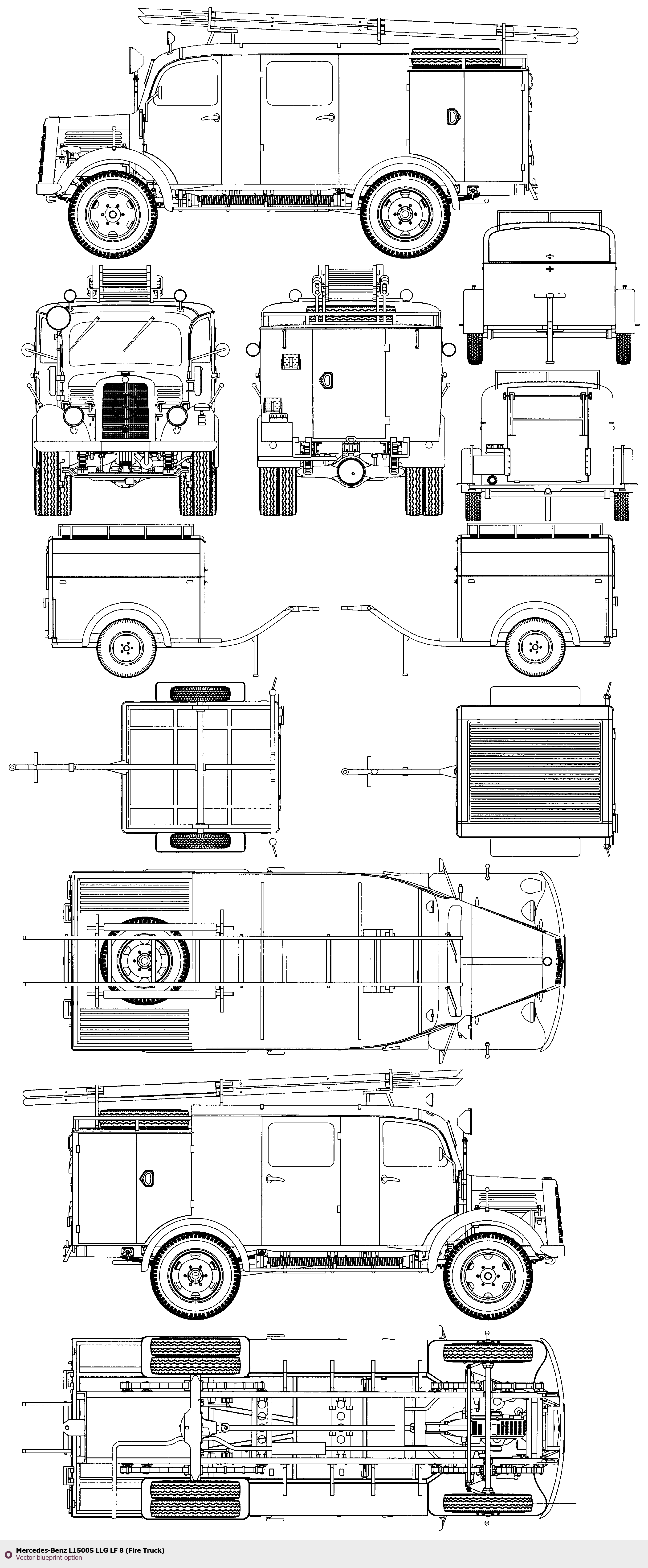 Raster blueprint of the Mercedes-Benz L1500S LLG LF 8 (Fire Truck) Heavy Truck. This free downloadable image can be used for graphic projects, digital design, and 3D modeling. The file provides accurate exterior proportions of the vehicle. Body type: Heavy Truck.