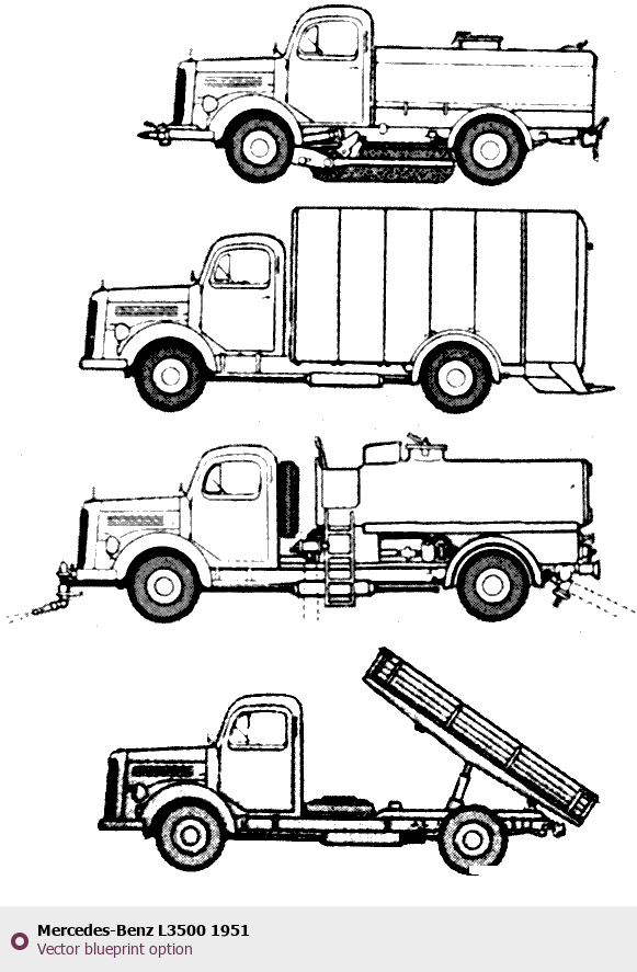 Raster blueprint of the 1951 Mercedes-Benz L3500 Heavy Truck. This free downloadable image can be used for graphic projects, digital design, and 3D modeling. The file provides accurate exterior proportions of the vehicle. Model year: 1951. Body type: Heavy Truck.