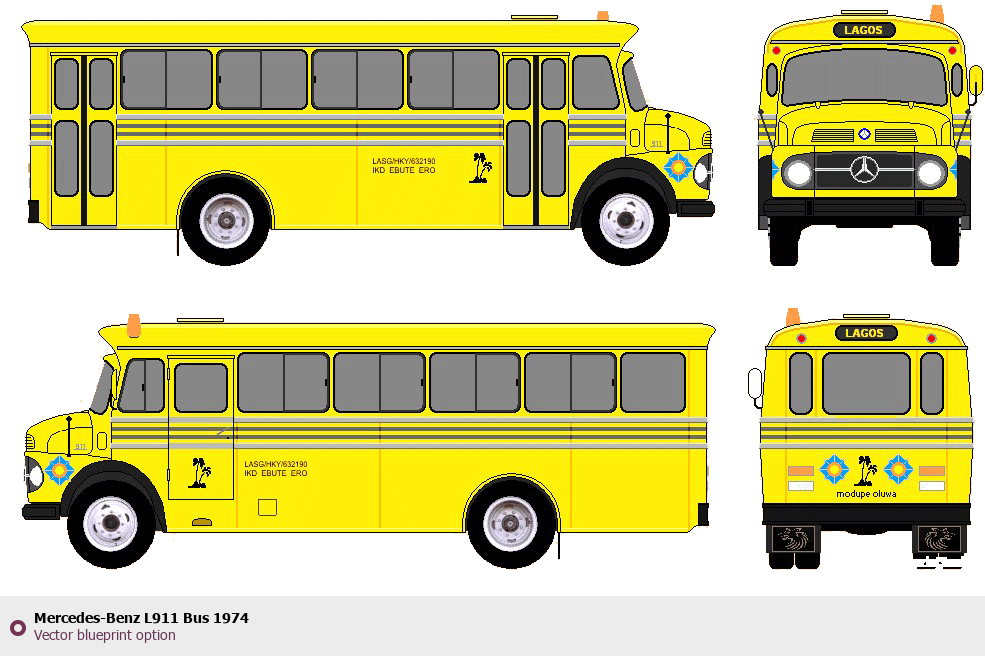 Raster blueprint of the 1974 Mercedes-Benz L911 Bus Bus. This free downloadable image can be used for graphic projects, digital design, and 3D modeling. The file provides accurate exterior proportions of the vehicle. Model year: 1974. Body type: Bus.