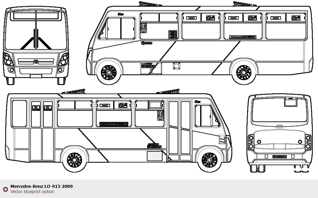 Raster blueprint of the 2009 Mercedes-Benz LO-915 Bus. This free downloadable image can be used for graphic projects, digital design, and 3D modeling. The file provides accurate exterior proportions of the vehicle. Model year: 2009. Body type: Bus.