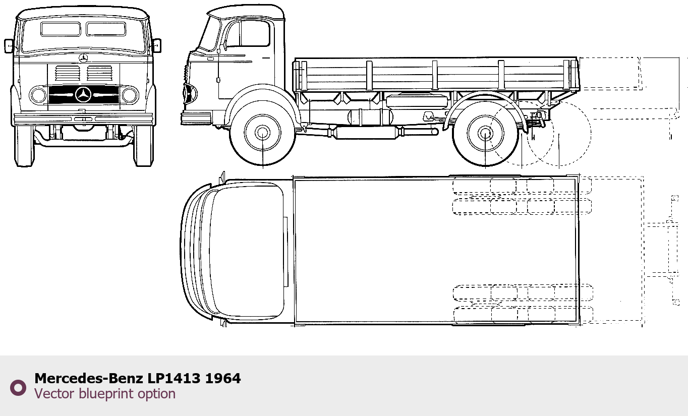 Raster blueprint of the 1964 Mercedes-Benz LP1413 Heavy Truck. This free downloadable image can be used for graphic projects, digital design, and 3D modeling. The file provides accurate exterior proportions of the vehicle. Model year: 1964. Body type: Heavy Truck.