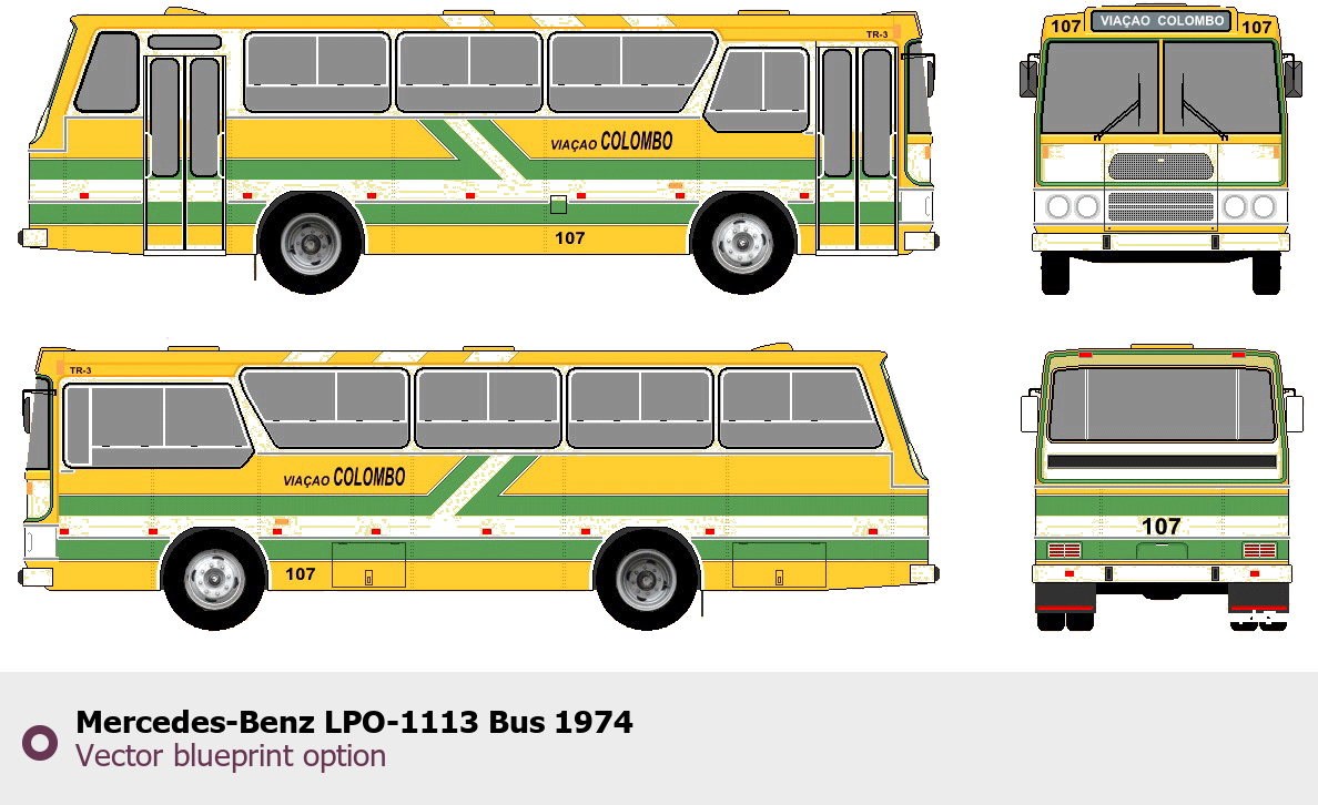 Raster blueprint of the 1974 Mercedes-Benz LPO-1113 Bus Bus. This free downloadable image can be used for graphic projects, digital design, and 3D modeling. The file provides accurate exterior proportions of the vehicle. Model year: 1974. Body type: Bus.