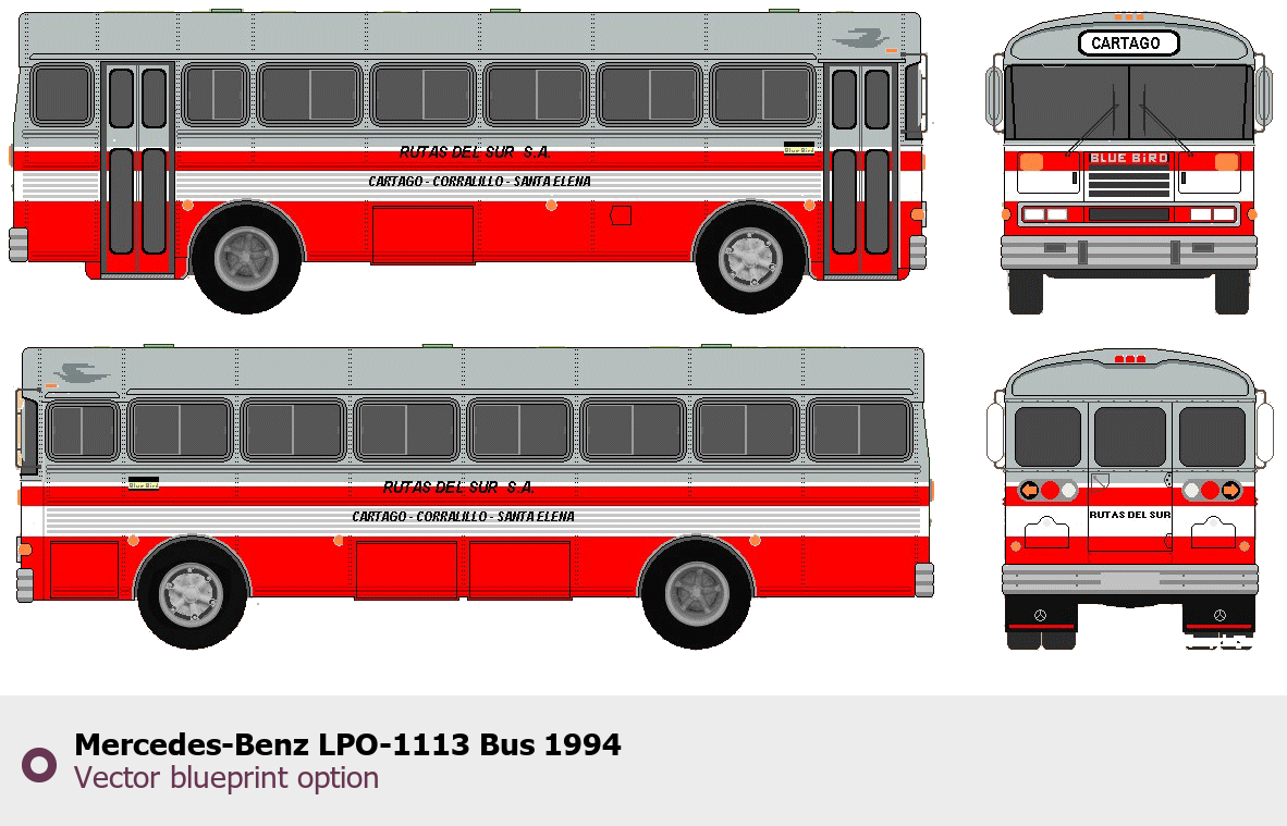 Raster blueprint of the 1994 Mercedes-Benz LPO-1113 Bus Bus. This free downloadable image can be used for graphic projects, digital design, and 3D modeling. The file provides accurate exterior proportions of the vehicle. Model year: 1994. Body type: Bus.