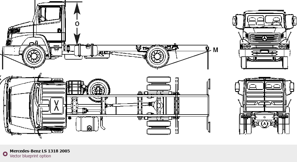 Raster blueprint of the 2005 Mercedes-Benz LS 1318 Heavy Truck. This free downloadable image can be used for graphic projects, digital design, and 3D modeling. The file provides accurate exterior proportions of the vehicle. Model year: 2005. Body type: Heavy Truck.