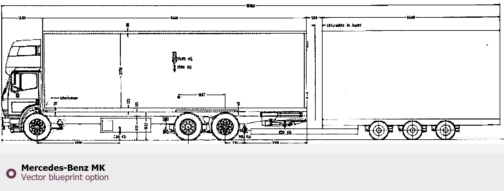 Raster blueprint of the Mercedes-Benz MK Heavy Truck. This free downloadable image can be used for graphic projects, digital design, and 3D modeling. The file provides accurate exterior proportions of the vehicle. Body type: Heavy Truck.