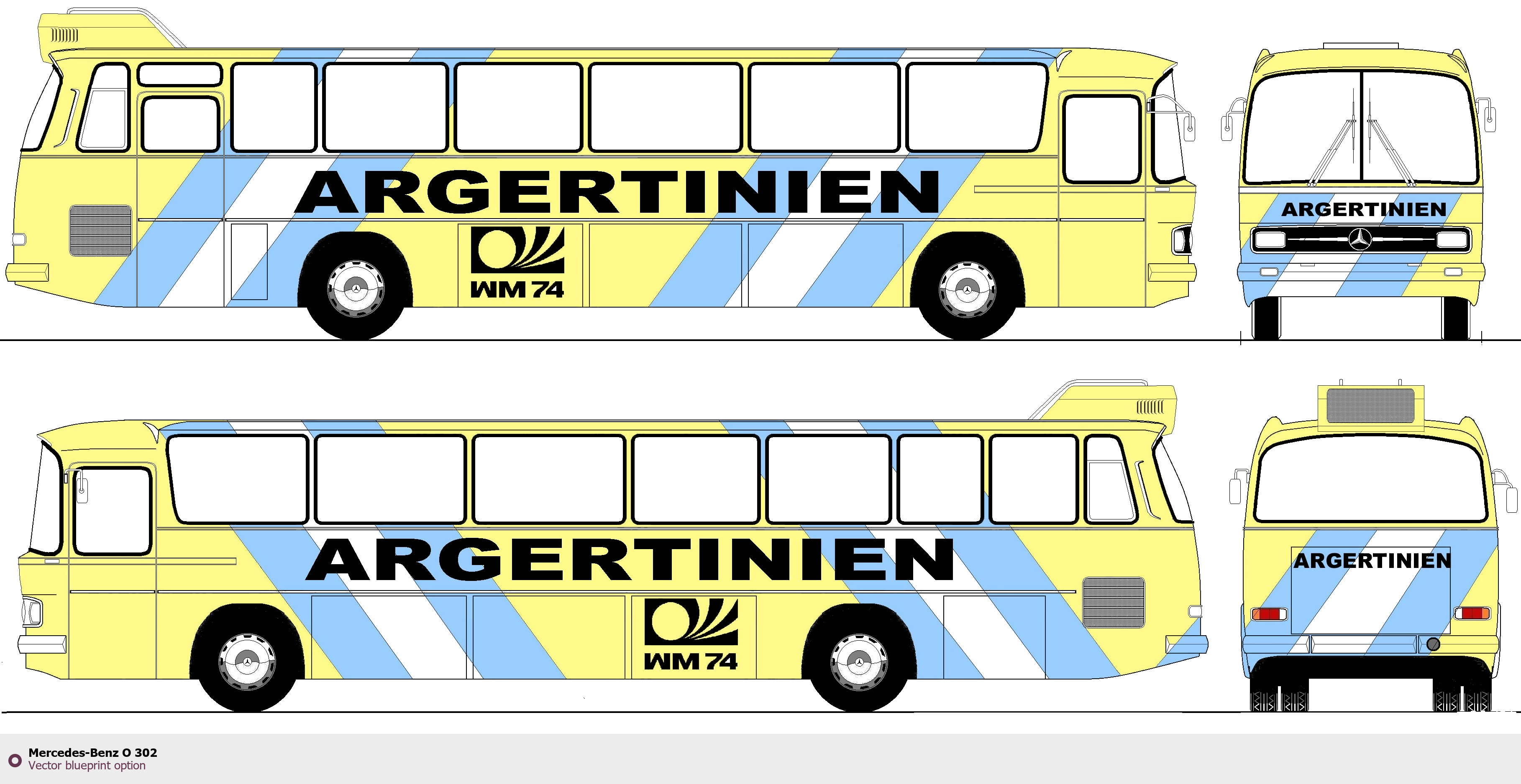 Raster blueprint of the Mercedes-Benz O 302 Bus. This free downloadable image can be used for graphic projects, digital design, and 3D modeling. The file provides accurate exterior proportions of the vehicle. Body type: Bus.