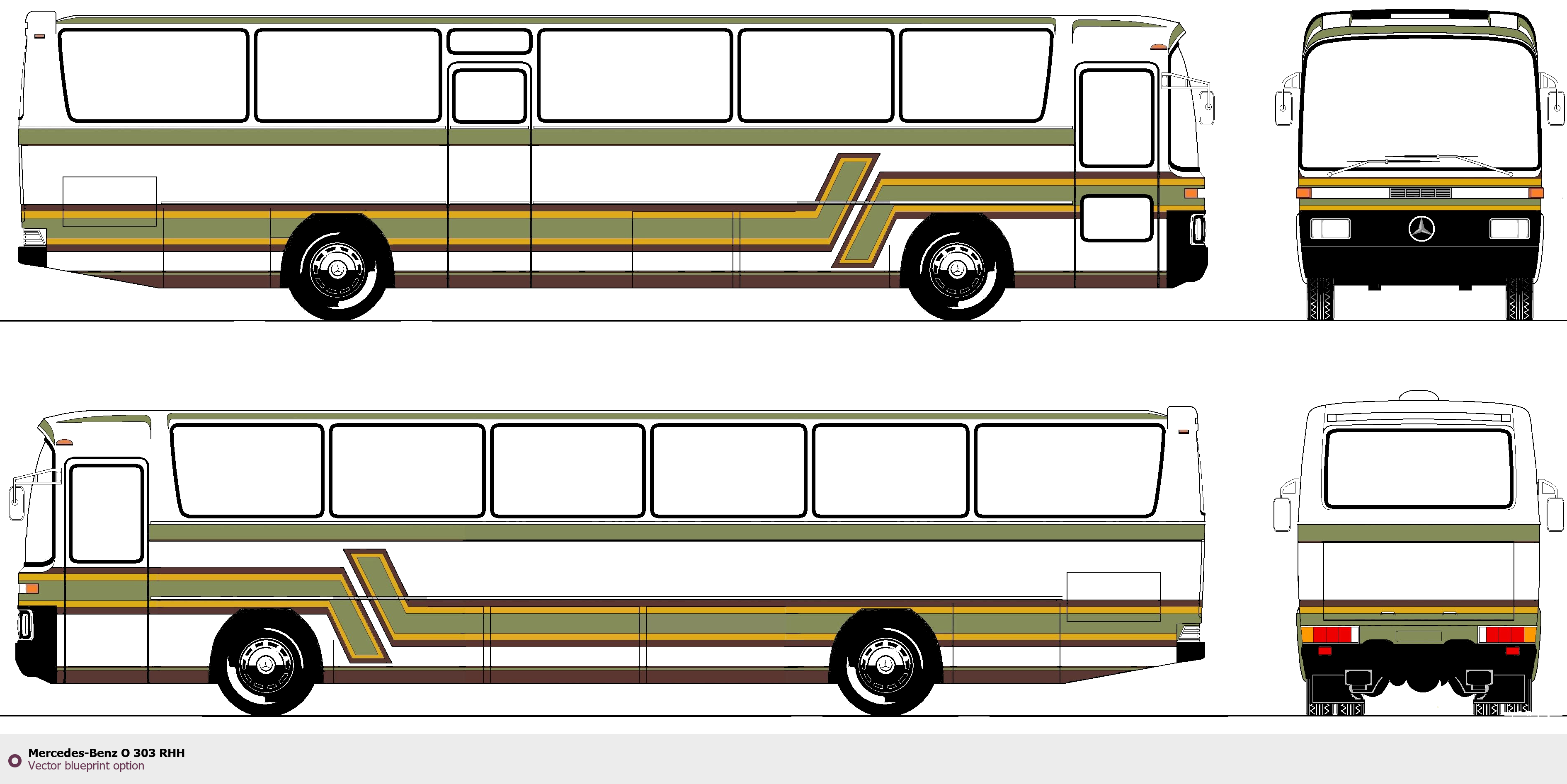 Raster blueprint of the Mercedes-Benz O 303 RHH Bus. This free downloadable image can be used for graphic projects, digital design, and 3D modeling. The file provides accurate exterior proportions of the vehicle. Body type: Bus.