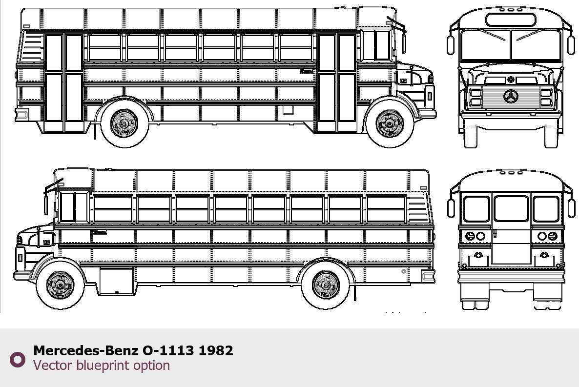 Raster blueprint of the 1982 Mercedes-Benz O-1113 Bus. This free downloadable image can be used for graphic projects, digital design, and 3D modeling. The file provides accurate exterior proportions of the vehicle. Model year: 1982. Body type: Bus.