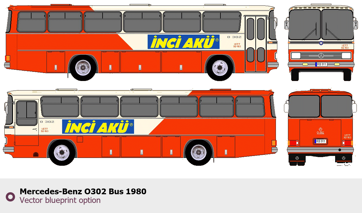 Raster blueprint of the 1980 Mercedes-Benz O302 Bus Bus. This free downloadable image can be used for graphic projects, digital design, and 3D modeling. The file provides accurate exterior proportions of the vehicle. Model year: 1980. Body type: Bus.