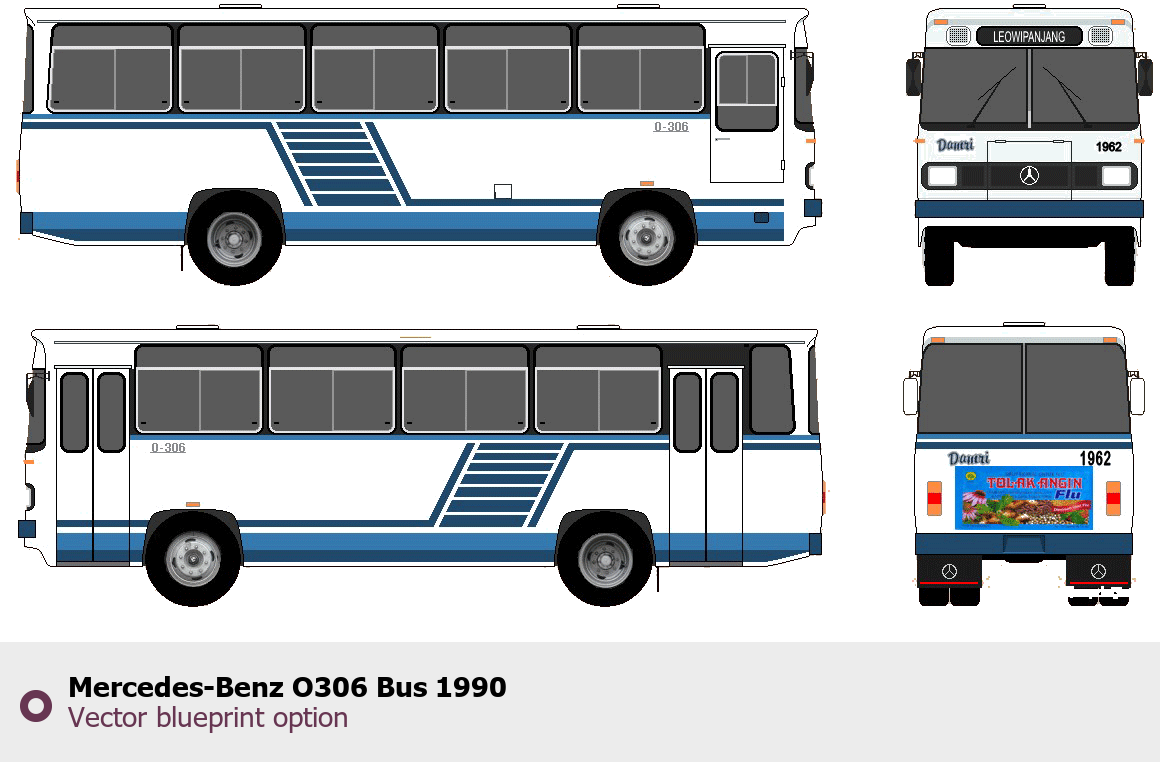 Raster blueprint of the 1990 Mercedes-Benz O306 Bus Bus. This free downloadable image can be used for graphic projects, digital design, and 3D modeling. The file provides accurate exterior proportions of the vehicle. Model year: 1990. Body type: Bus.