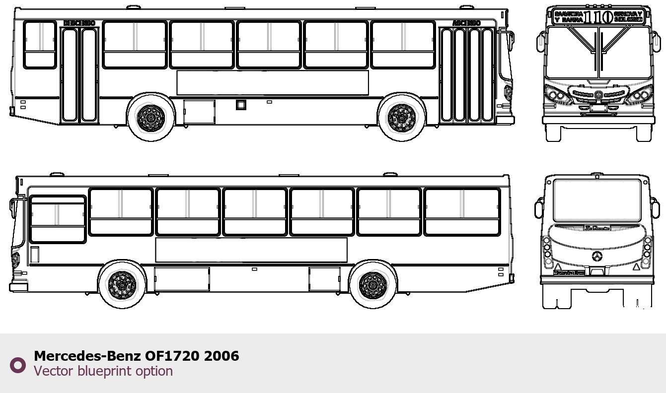 Raster blueprint of the 2006 Mercedes-Benz OF1720 Bus. This free downloadable image can be used for graphic projects, digital design, and 3D modeling. The file provides accurate exterior proportions of the vehicle. Model year: 2006. Body type: Bus.