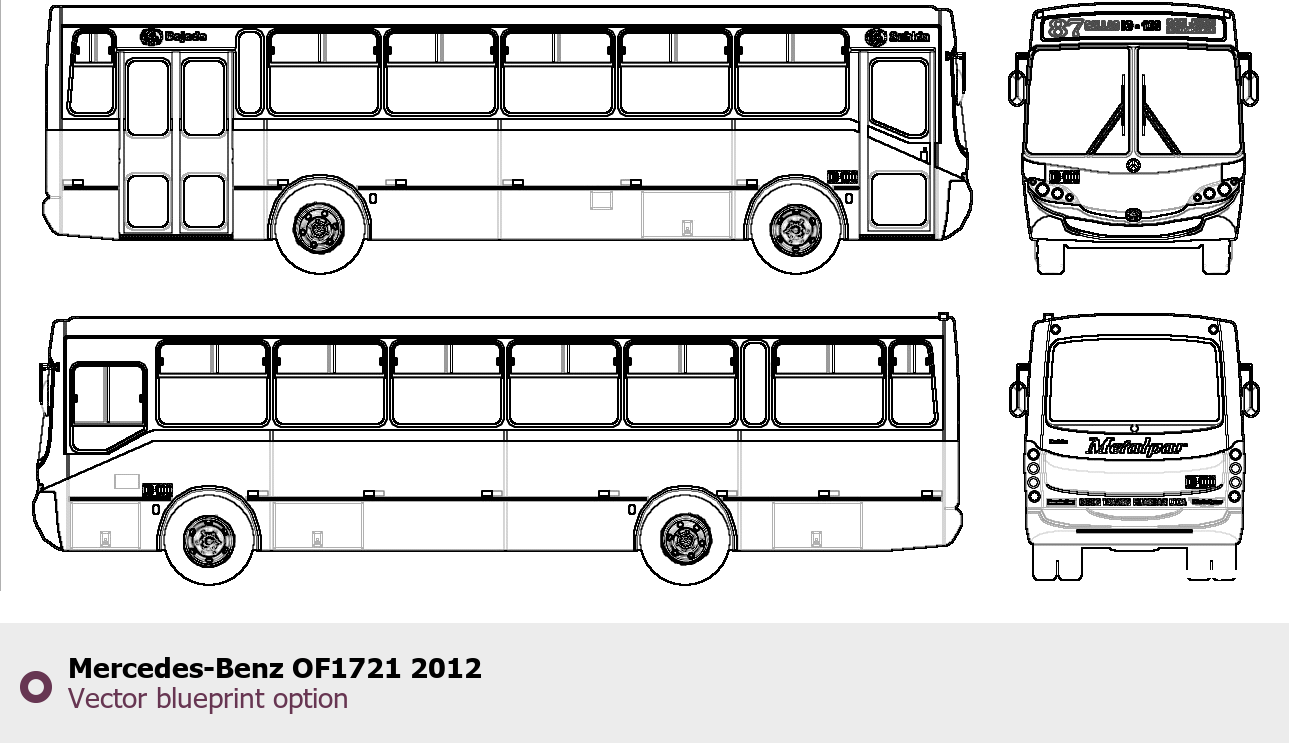 Raster blueprint of the 2012 Mercedes-Benz OF1721 Bus. This free downloadable image can be used for graphic projects, digital design, and 3D modeling. The file provides accurate exterior proportions of the vehicle. Model year: 2012. Body type: Bus.