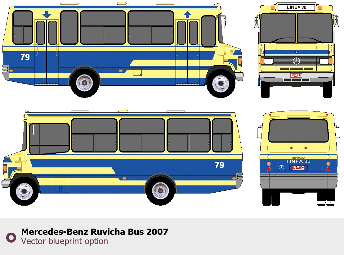 Raster blueprint of the 2007 Mercedes-Benz Ruvicha Bus Bus. This free downloadable image can be used for graphic projects, digital design, and 3D modeling. The file provides accurate exterior proportions of the vehicle. Model year: 2007. Body type: Bus.