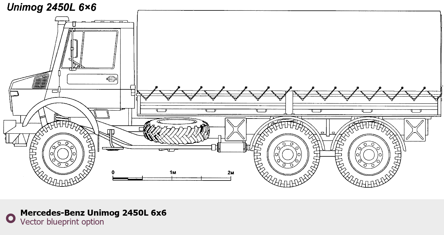 Raster blueprint of the Mercedes-Benz Unimog 2450L 6x6 Heavy Truck. This free downloadable image can be used for graphic projects, digital design, and 3D modeling. The file provides accurate exterior proportions of the vehicle. Body type: Heavy Truck.
